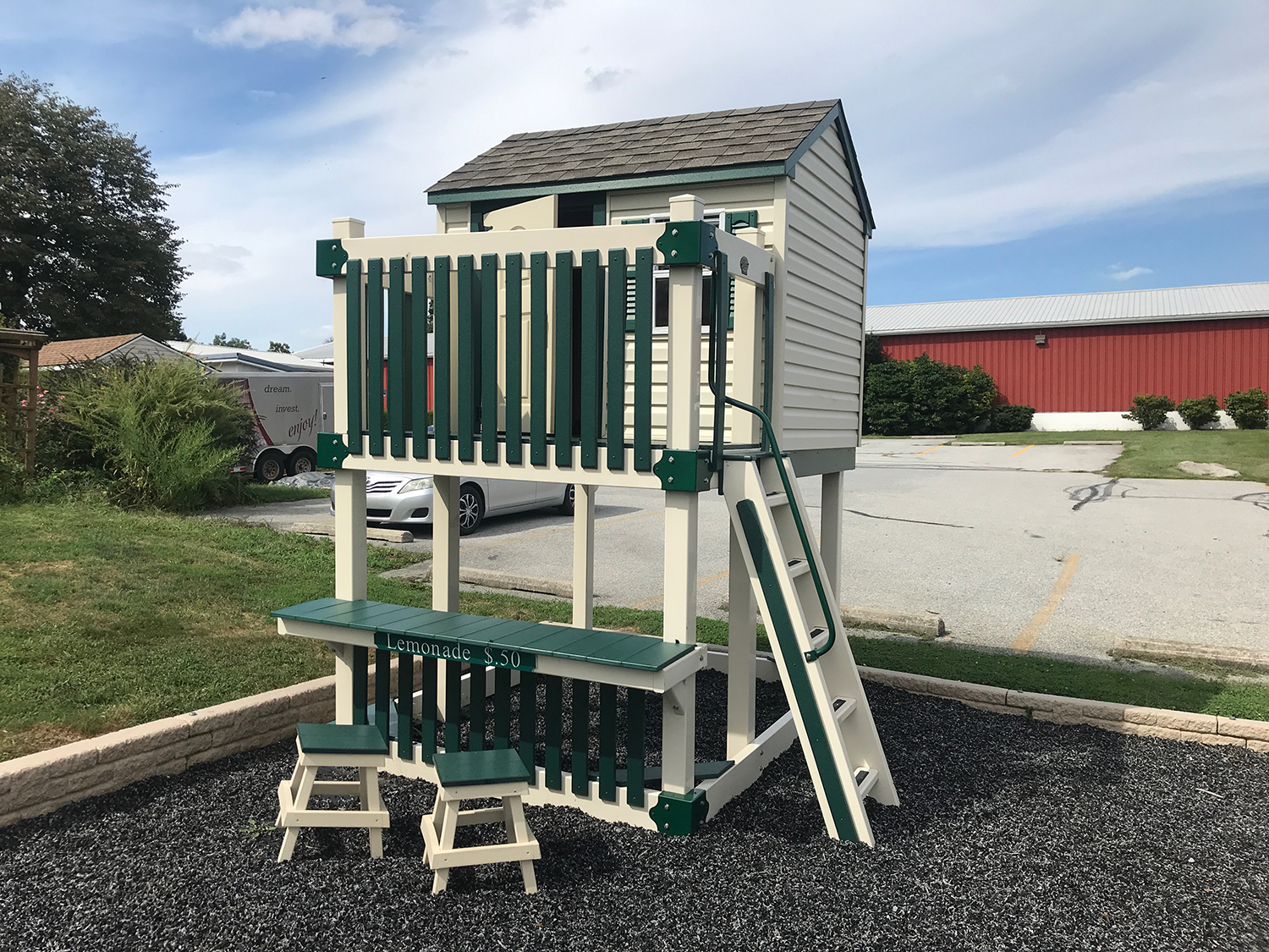 6'x8' hideout house, access ladder with railing, lemonade stand with 2 stools.