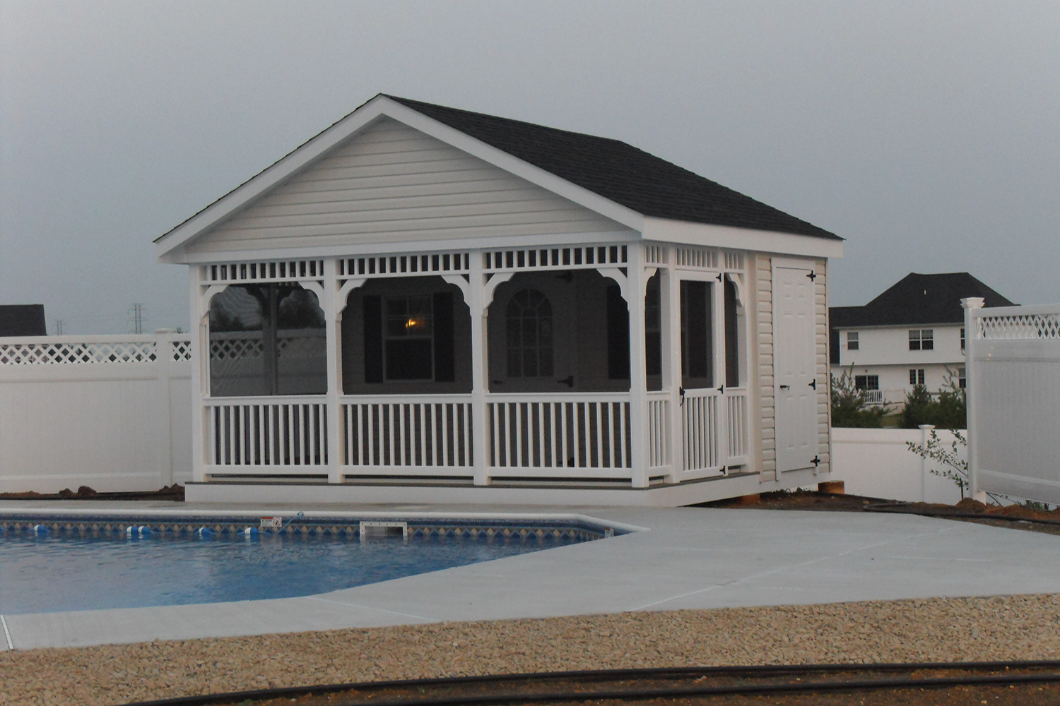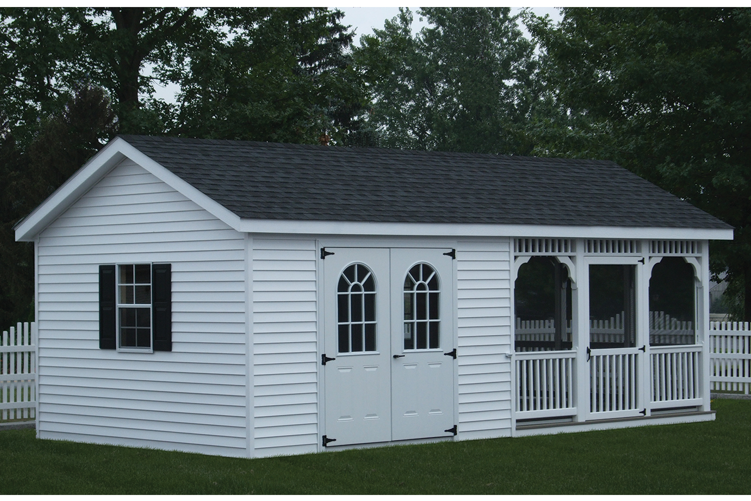 2 - 24 x 36 single hung windows w/ screens & shutters, 11 - lite single door 11 - lite double door aluminum sill protector for doors gable vents 7.5" gable overhangs, 4.5" eave overhangs 87.25" walls 6 pitch aframe roof porch half length of building