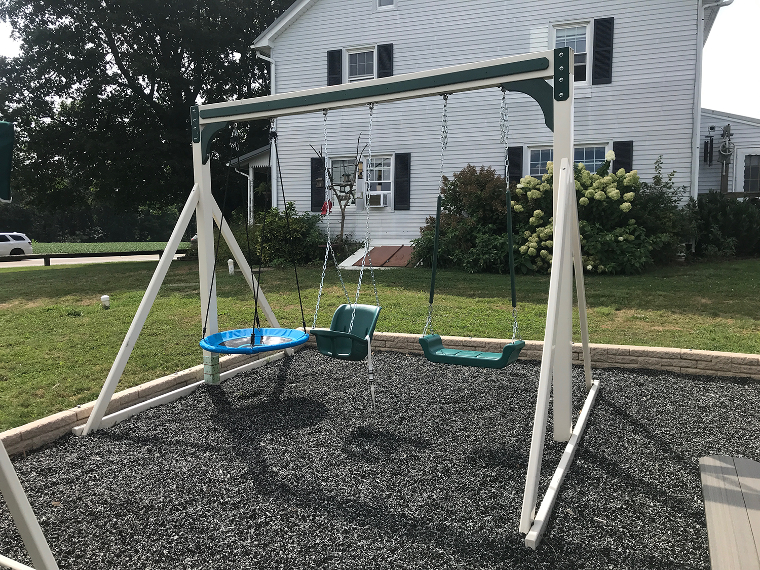 vinyl 3 position free standing single beam, web swing, baby swing, hard seat swing with soft grip chain.