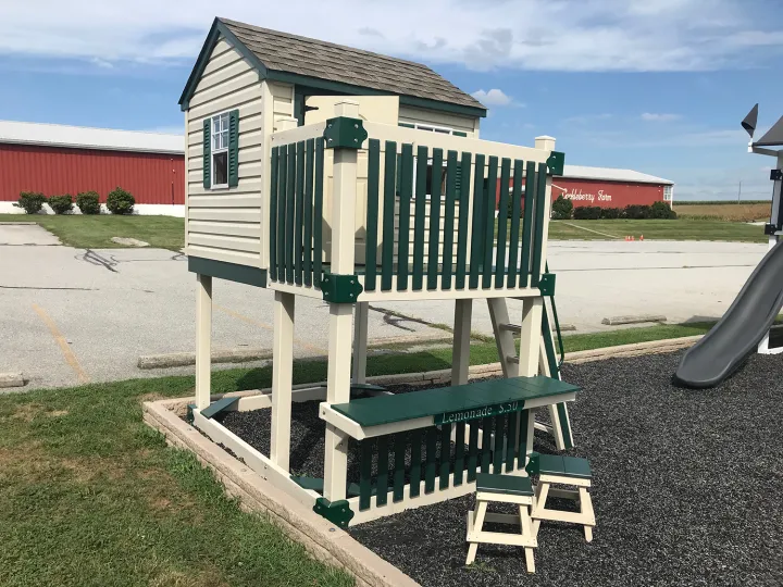 6'x8' hideout house, access ladder with railing, lemonade stand with 2 stools.