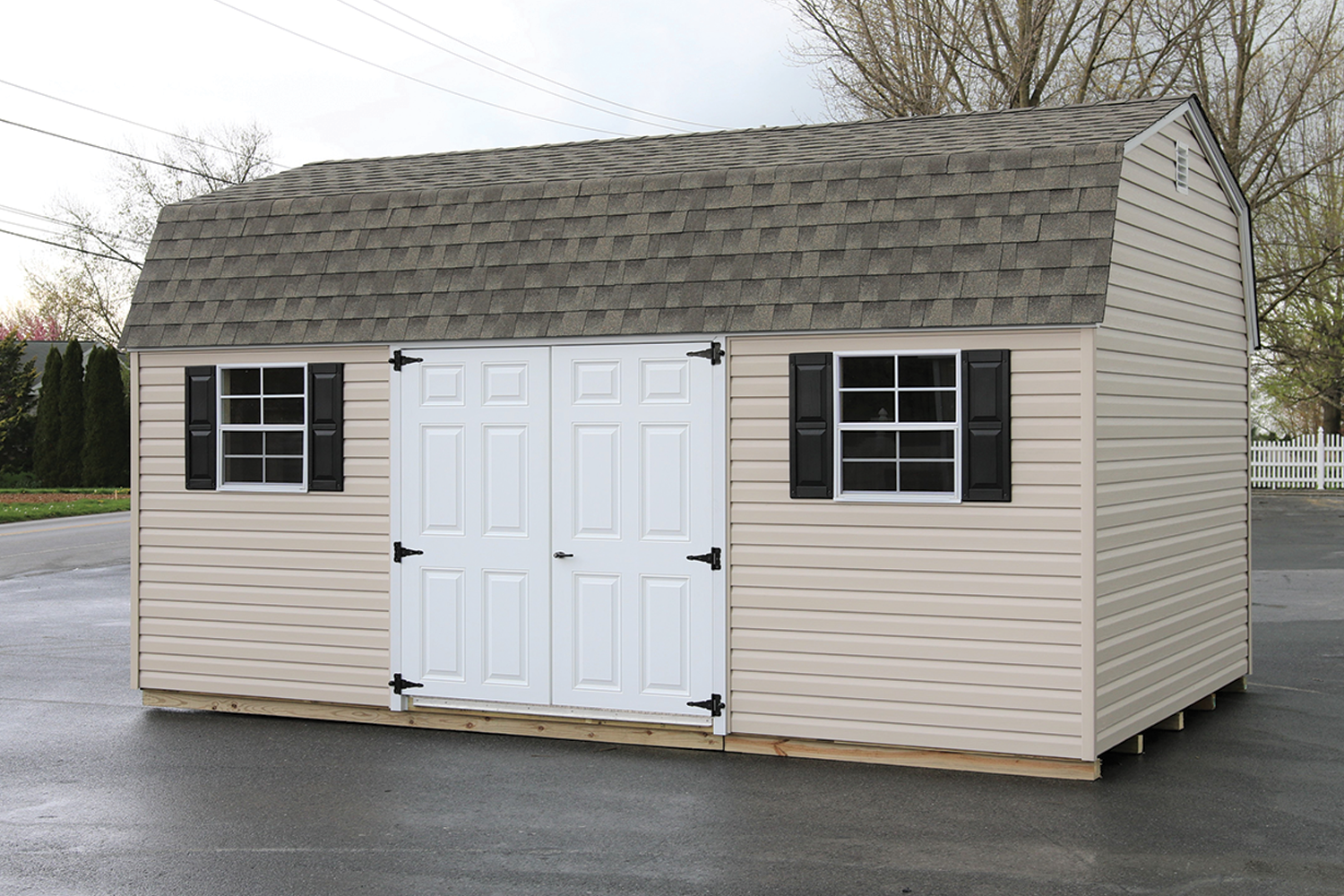 2 - 18 x 27 single hung windows w/ screens & shutters (16' and longer, 24 x 27 windows) double door aluminum sill protector for door gable vents 1" overhangs 75" wall gambrel roof
